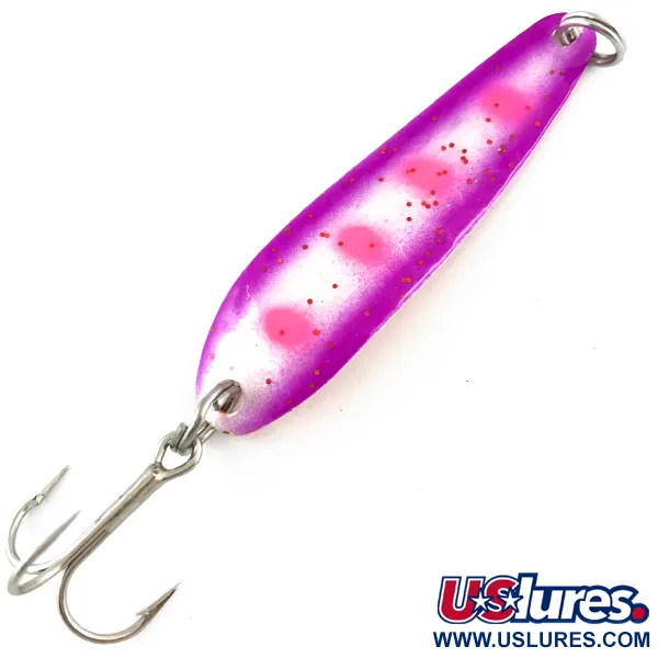 Deze 5g (3/16oz) trolling lepel van Advance Tackle is voorzien van een klassieke gehamerde koperen afwerking aan de achterzijde. De voorkant loopt over van levendige paarse randen naar een helder wit centrum, geaccentueerd door vier duidelijke roze stippen en een subtiel laagje rode glitters. Met een lengte van 5,5 cm (2 1/4") is deze in de USA gemaakte Stinger Scorpio (productcode 4282) voorzien van de naam en herkomst uit Michigan, direct gestempeld in de koperen plating met honingraatpatroon. Dit specifieke exemplaar verkeert in 5/5 conditie, met behoud van volledige glans op de metalen achterzijde en scherpe definitie op de geverfde zijde. De hardware bestaat uit een scherpe dreg en dubbele splitringen, geoptimaliseerd voor trolling-montages waarbij het contrast tussen de opvallende lak en de warme koperglans het meest effectief is. Het smalle, langwerpige profiel is kenmerkend voor de trolling-ontwerpen uit de late 20e eeuw van de Grote Meren, bedoeld voor de visserij op forel en zalm.