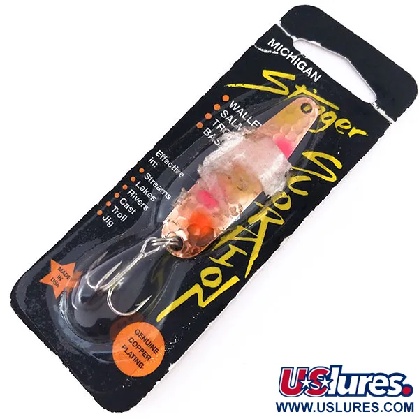 Echt koperen beplating met een kenmerkende gehamerde afwerking vormt de basis voor deze 5,5 cm (2 1/4") Stinger Scorpion lepel. Geproduceerd door Advance Tackle in de VS, draagt dit exemplaar de productcode 10058 en is voorzien van het kleurpatroon «Confusion», herkenbaar aan de felroze en oranje accenten tegen het getextureerde koper. Met een gewicht van 5 g (3/16 oz) is dit kunstaas ontworpen voor meerdere vissoorten, waarbij de originele verpakking de effectiviteit voor snoekbaars, zalm, forel en baars vermeldt. Het merk Michigan Stinger heeft een jarenlange reputatie in de regio van de Grote Meren, met name voor trollen en werpend vissen. Dit kunstaas wordt gepresenteerd in de originele blisterverpakking en is ongebruikt, wat overeenkomt met een conditiescore van 6. De montage bestaat uit een stevige splitring en een scherpe dreg, ontworpen voor de zware belasting bij het jiggen of trollen.