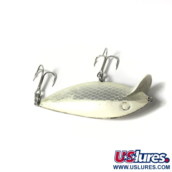 Een kenmerkend honingraat-schubbenpatroon definieert de Silver White afwerking op deze vintage Storm Original Thin Fin, die een klassiek tijdperk van Amerikaans hengelsportontwerp vertegenwoordigt. Met een lengte van 7 cm (2 3/4") en een gewicht van 5,5 g (3/16 oz) maakt dit model – code 0034 – gebruik van een plat profiel dat specifiek is voor trollen en driften. De afwerking vertoont lichte ouderdomssporen, wat een conditie-beoordeling van 4/5 oplevert, terwijl de zilveren schubbenprint zijn oorspronkelijke definitie behoudt. Vervaardigd in de VS, is het lichaam uitgerust met zijn originele dreggen en een gespecialiseerde duiklip die bedoeld is om de stabiliteit te behouden, zelfs in een sterke stroming. Deze lip laat de plug van links naar rechts bewegen op een manier die consistent is met een natuurlijke prooi. Lichte lakslijtage is zichtbaar langs de randen van de lip, wat de geschiedenis als functioneel vistuig documenteert.