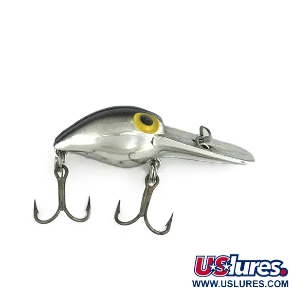 Een glanzende zilveren chroomafwerking kenmerkt dit compacte model en benadrukt zijn Pre-Rapala erfgoed uit de originele USA-productie van Storm. Met een gewicht van slechts 1/8 oz (4 g) en een lengte van 1 1/4" (3 cm), is de Pee Wee Wart een gespecialiseerde drijvende dieploper voor het vissen op baars en snoekbaars. De lange duiklip is duidelijk voorzien van de PEEWEE WART-stempel, die scherp en leesbaar is gebleven. Visueel heeft de plug een klassieke zwarte rug die contrasteert met de zilveren zijkanten, geaccentueerd door opvallende gele ogen met zwarte pupillen. Deze plug, gecatalogiseerd onder productcode 7320, verkeert in uitzonderlijke staat met een score van 5/5. Beide originele dreggen zijn aanwezig en zien er goed uit. Geproduceerd vóór de overname door Rapala, vertegenwoordigt dit een specifiek tijdperk van Amerikaanse hengelsportproductie waarin deze kleine crankbaits aan populariteit wonnen voor zowel werpen als trollen.