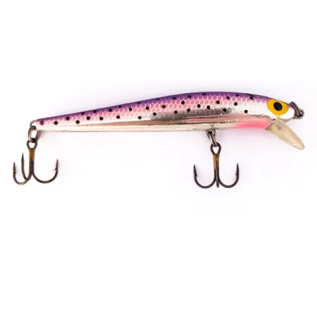 Verchroomde zijkanten en een paars-roze rug kenmerken het Rainbow Trout-patroon op dit 7 g (1/4 oz) minnow-profiel. Deze Storm Thunder Stick, bekend onder productcode 10478, heeft een slank lichaam van 9 cm (3 1/2") dat is ontworpen om te duiken tussen 0,3 en 1,5 m (1 ft - 5 ft). Het is een klassiek voorbeeld van Amerikaanse makelij, uitgerust met een transparante plastic duiklip en twee stevige dregers. De details in de lak bevatten fijne zwarte stippen en felgele ogen met zwarte pupillen, kenmerkend voor de aandacht van het merk voor visuele prikkels. Beoordeeld met een conditie van 5/5, verkeert het kunstaas in uitstekende staat, waarbij de metallic afwerking en het beslag glanzend zijn gebleven. De balans en het gewicht maken het geschikt voor diverse werptechnieken bij het vissen op snoekbaars, snoek of forel in ondieper water.