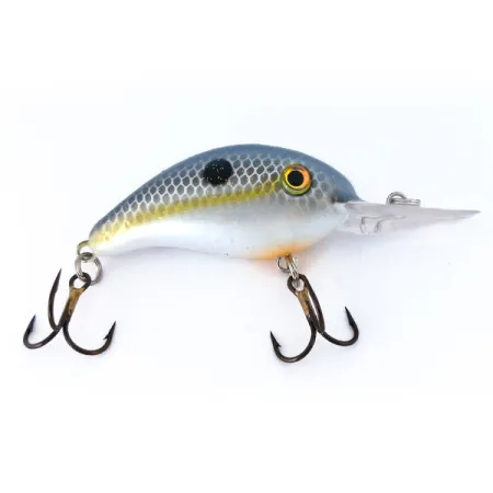 Een blauwe en grijze rug met schubbenpatroon gaat over in een duidelijke gele zijlijn op deze 10g (1/3oz) Strike King 4XD. Herkenbaar aan productcode 10398, heeft de Sexy Shad-uitvoering een parelmoerwitte buik met een subtiel oranje accent onder de duiklip. Deze drijvende crankbait is ontworpen om dieptes tussen 2,4 en 3,6 m (8-12 ft) te bereiken tijdens het werpen of trollen op snoek en snoekbaars. De interne ratels zorgen voor een technisch geluidsprofiel, terwijl het lichaam van 5 cm (2") een compact profiel behoudt. Elk van de twee bronzen dreggen is in uitstekende staat, passend bij de algemene 5/5 conditie van dit exemplaar. Een enkele zwarte stip op de bovenflank is kenmerkend voor dit specifieke kleurenschema. De grote, heldere duiklip is stevig bevestigd, klaar voor diepwaterverkenning.