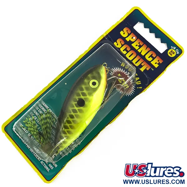 Voorzien van een kenmerkende chartreuse met zwarte schubafwerking en een opvallende stip op de flank (kleur 245 535), bevindt dit 10,5 g (3/8 oz) kunstaas zich in de originele verpakking. Met een lengte van 6,5 cm (2 1/2") is de Strike King Spence Scout (productcode 7403) een drijvend, luidruchtig aasje ontworpen voor presentaties aan de oppervlakte of net daaronder. Deze specifieke "New Scout" versie valt op door de twee bevestigingspunten voor de lijn, waardoor variabele dieptes tussen 0,3 en 0,9 m (1-3 ft) mogelijk zijn, afhankelijk van welk oog wordt gebruikt. Geproduceerd in Mexico, dit exemplaar is ongebruikt en verkeert in originele staat, beoordeeld met een 6. Het opvallende gele oog en het ruitvormige schubpatroon op de zijkanten zorgen voor een hoog contrast, ideaal voor het vissen op baars in troebel water.