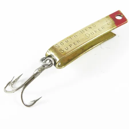 Het merk en modelnummer zijn duidelijk in de goudkleurige metalen body gestanst en identificeren deze South Bend Super Duper 500 als een echte Amerikaanse klassieker. Met een lengte van slechts 2,5 cm (1") en een licht gewicht van 1,4 g (3/64 oz), is dit exemplaar voorzien van de iconische U-bocht die synoniem staat voor de productie van het merk uit het midden van de vorige eeuw. De metalen oppervlakken hebben een heldere gouden glans behouden, geaccentueerd door een kenmerkende rode punt bij het oogje. Op de achterkant is het patentnummer 2.719.378 scherp ingeperst, wat de historische afkomst onder productcode 3486 bevestigt. Een conditiescore van 4/5 geeft aan dat de lepel goed is onderhouden, waarbij de originele dreg en splitring intact zijn gebleven. Dit specifieke model is ontworpen voor finesse werpen of licht trollen. De markeringen blijven zeer goed leesbaar, wat de kwaliteit van het oorspronkelijke fabricageproces in de VS aantoont.