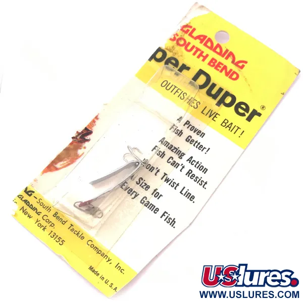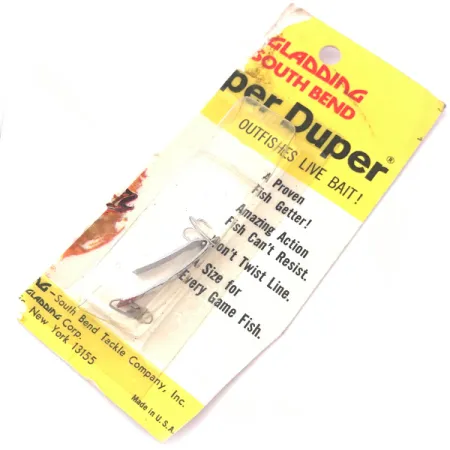 Gepolijste nikkelen oppervlakken met een felrode punt kenmerken deze 2,5 cm (1") South Bend Super-Duper 500, een minuscuul U-vormig metalen kunstaas. Met een gewicht van slechts 1,4 g (3/64 oz) is dit exemplaar ongebruikt gebleven in de originele verpakking van de Gladding-South Bend Tackle Company, met productcode 3930. De constructie bestaat uit een enkel stuk gebogen metaal, ontworpen om de eigenschappen van een lepel en een spinner te combineren. Gemaakt in de VS, bevat de vintage gele kaart graphics uit die tijd en de bewering dat hij "beter vangt dan levend aas". De montage omvat een kleine dreg aan de achterzijde van het gebogen lichaam, beschermd door de originele transparante plastic behuizing.