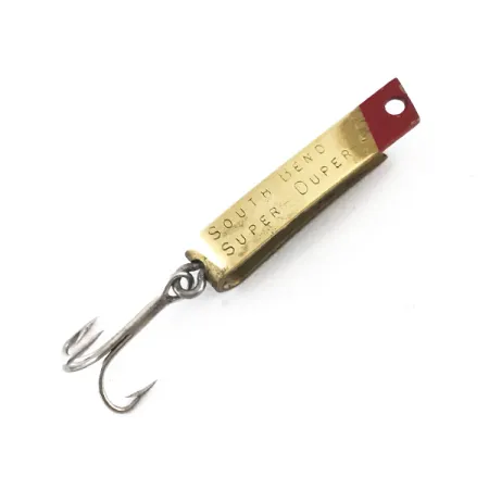 Met een gewicht van slechts 3/64 oz (1,4 g) is deze kleine metalen lepel een klassieke ultra-light keuze voor forel en baarsachtigen. De goudkleurige messing body van deze Super-Duper 500 is voorzien van de iconische naam "SOUTH BEND SUPER-DUPER", duidelijk in het metaal gestempeld. Bij het oogje zorgt een opvallende rood geverfde punt voor een scherp contrast met het goudkleurige oppervlak. Wanneer men het 1" (2,5 cm) lange kunstaas omdraait, wordt het historische patentnummer 2719378 zichtbaar, wat de oorsprong in het Amerikaanse hengelsportontwerp van het midden van de eeuw bevestigt. Dit exemplaar, aangeduid met productcode 5257, behoudt zijn originele stijl dreg die met een splitring is bevestigd aan de U-vormige bocht. Het kunstaas ziet er solide uit met een conditiescore van 4/5 en vertoont slechts lichte ouderdomssporen op de metalen oppervlakken.