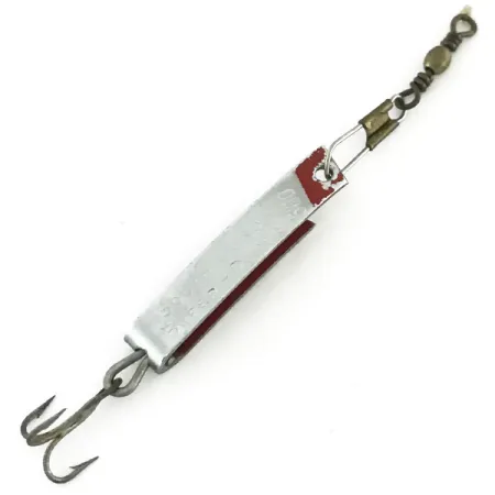 Op het gevouwen metalen lichaam is het patentnummer 2.710.272 duidelijk ingestanst, wat deze 1" (2,5 cm) South Bend Super Duper 500 identificeert als een klassieker uit de Amerikaanse hengelsportgeschiedenis. Dit exemplaar, gecatalogiseerd onder productcode 8642, heeft het unieke U-vormige ontwerp dat de eigenschappen van een lepel en een spinner combineert in één instrument voor licht materiaal. De Nickel / Red afwerking zorgt voor een heldere, reflecterende buitenkant die gecontrasteerd wordt door een opvallende rode streep langs de binnenste buiging van het metaal. Met een gewicht van slechts 1,4 g (3/64 oz) is het kunstaas uitgerust met het originele beslag, waaronder een kleine dreg en een koperkleurige tonwartel met een speld. Met een conditiebeoordeling van 5/5 zijn de metalen oppervlakken opmerkelijk schoon en de modelaanduiding "500" blijft scherp en leesbaar tegen het gepolijste nikkel. Dit in de VS gemaakte kunstaas is specifiek gebouwd voor werpen en technieken met lichte lijnen, waarbij het vertrouwt op zijn uitgesproken geometrie en metalen afwerking voor zichtbaarheid.