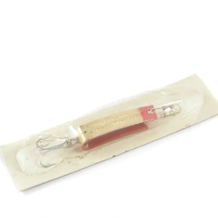 Gouden en rode afwerkingen harmoniëren op dit vintage model van 2,3 g (3/32 oz), een ontwerp dat de grens tussen een traditionele lepel en een spinner vervaagt. Het bovenoppervlak van het metalen lichaam van 3 cm (1 1/4") is voorzien van een diepgeperste stempel die het identificeert als een South Bend-creatie, specifiek de Super-Duper 501 onder productcode 1889. Een levendig rood kleuraccent markeert de achterrand en zorgt voor een scherp visueel contrast tegen de vergulde afwerking. Gebleven in de originele vintage blisterverpakking, is dit exemplaar ongebruikt en opmerkelijk goed bewaard gebleven. De hardware bestaat uit een enkele dreg aan de achterzijde, bevestigd via een stevige splitring, met de schone oppervlakken en scherpe punten van een fabrieksnieuw kunstaas. Vissers gaven historisch gezien de voorkeur aan deze unieke gebogen metalen vorm vanwege het vermogen om licht vanuit meerdere hoeken te vangen tijdens het binnenvissen, waardoor het een favoriet werd voor liefhebbers van forel en baars.