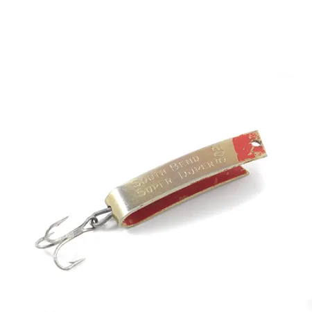 Geponst op de goudkleurige buitenkant met de modelnaam en "SOUTH BEND", is dit U-vormige kunstaas een herkenbare klassieker voor elke verzamelaar. Met een lengte van 3 cm (1 1/4") en een gewicht van slechts 2,5 g (3/32 oz), werd het ontworpen voor het vissen met licht materiaal. De binnenkant en de voorste punt zijn afgewerkt met een contrasterende rode verf, die opvalt tegen het metallic gouden lichaam. Geïdentificeerd door productcode 2667, is het patentnummer 2 719 378 op de onderkant gestempeld, wat de Amerikaanse herkomst bevestigt. De algehele staat is een respectabele 4/5, met lichte gebruikssporen die de vintage charme benadrukken. Een standaard dreg is aan de achterzijde bevestigd met een eenvoudige splitring.