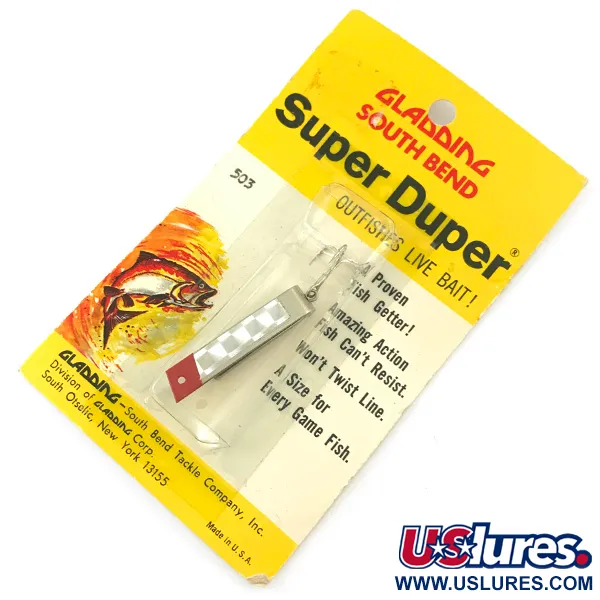 Vernikkelde oppervlakken gecombineerd met een opvallende rode punt und een wit ruitpatroon kenmerken dit klassieke Amerikaanse kunstaas. Geregistreerd onder code 4661, weegt deze South Bend Super-Duper 503 1/8 oz (4,3 g) en is 1 1/2 inch (3,5 cm) lang. Dit specifieke exemplaar is ongebruikt, bewaard in de originele gele verpakking uit het Gladding-tijdperk van de fabriek in South Otselic, New York. Het dunne metalen lichaam is gevormd in de iconische U-bocht die de Super-Duper decennialang tot een vast onderdeel maakte voor forel- en baarsvissers. Het kleurenschema Nikkel / Rood blijft levendig en toont de hoogwaardige verzilvering die typisch is voor de productie van South Bend uit het midden van de eeuw. Een enkele staarthaak is stevig aan de achterkant bevestigd, ontworpen voor werpen of trollen met lichte lijnen.