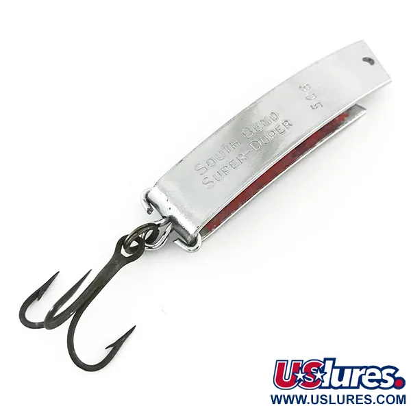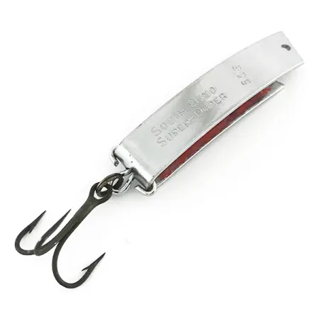 Gestempeld met de merknaam "South Bend SUPER-DUPER 506" op de bovenkant, heeft dit 4,5 cm (1 3/4") lange kunstaas de kenmerkende U-vormige gebogen metaalvorm die al generaties lang een vaste waarde is in tackleboxen. Met een gewicht van 7 g (1/4 oz) is dit exemplaar afgewerkt met een glanzende nikkelcoating aan de buitenkant, terwijl de binnenbocht is voorzien van een felrode laklaag voor een visueel profiel met hoog contrast. Aan de binnenzijde is de markering "PAT. PEND." duidelijk zichtbaar, een technisch detail dat duidt op een vroege productieserie van South Bend. De montage bestaat uit een enkele dreg bevestigd aan een splitring aan de achterzijde, die in uitstekende staat verkeert. Dit specifieke exemplaar is beoordeeld met 5/5 en vertoont een zeer gladde metalen afwerking en een opmerkelijk goed bewaard gebleven lak aan de binnenzijde. Dit in de VS gemaakte kunstaas met productcode 8512 is gebouwd voor werpen en trollen en vertegenwoordigt een unieke mid-century benadering van het ontwerp van metalen kunstaas.