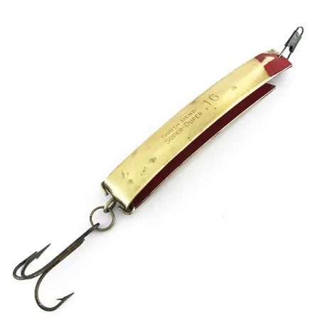 Duidelijk gestempeld met de vintage South Bend naam en maatmarkering 16, toont deze metalen lepel de iconische U-vormige vouw die uiteindelijk een vaste waarde werd in de Luhr Jensen catalogus onder code 8096. Met een lengte van 8,5 cm (3 1/4") heeft het kunstaas een gepolijste messing afwerking op de buitenste bocht, gecontrasteerd door een levendig rood accent in het binnenkanaal. Het gewicht van 18 g (2/3 oz) zorgt voor aanzienlijke massa voor verre worpen of het bereiken van diepere zones tijdens het trollen. Deze specifieke Super-Duper 516 is in 4/5 conditie en heeft zijn originele glans behouden met slechts kleine tekenen van ouderdom. Het beslag blijft robuust, met een grote dreg die is bevestigd via een stevige metalen ring aan de basis van de bocht. Hoewel het ontwerp door de decennia heen bij verschillende fabrikanten is ondergebracht, blijft het kenmerkende profiel van dit Amerikaanse metalen kunstaas een favoriet onder verzamelaars vanwege de unieke vorm en het eenvoudige, effectieve kleurenschema.