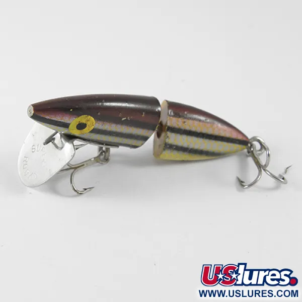 Een totaalgewicht van 5,5g (3/16oz) kenmerkt deze Rockland Super Rocky, een vintage Amerikaans kunstaas uit de jaren 40. Geregistreerd onder productcode 1568, heeft het lichaam van 6cm (2 1/4") een tweedelige gelede constructie bedoeld voor het werpend vissen. Het kleurenschema is een opvallende combinatie van zwart, bruin en geel, met een donkere metallic bovenzijde en horizontale zwarte strepen over een zilver-geschubde gele flank. Een prominente metalen duiklip is met een kleine schroef aan het kopgedeelte bevestigd, net onder de handgeschilderde gele ogen met zwarte pupillen. Dit specifieke exemplaar verkeert in 4/5 conditie en behoudt een schone afwerking met minimale sporen van zijn lange geschiedenis. Dubbele dreggen zijn gemonteerd via schroefogen, kenmerkend voor het beslag dat in die periode werd gebruikt.