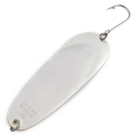 Verzilvering aan de ene kant en een goudkleurige messing afwerking aan de achterzijde zorgen voor een veelzijdige schittering die al generaties lang vissen misleidt. Met een lengte van 9 cm (3 1/2") en een gewicht van 7 g (1/4 oz) maakt de extreem dunne messing constructie de specifieke trillende actie mogelijk die Sutton-kunstaas legendarisch heeft gemaakt onder forel- en zalmvissers. De stempel “88 SUTTON CO. NAPLES, N.Y.” blijft scherp op de zilveren zijde, wat de herkomst en productcode 22946 identificeert. Dit exemplaar is uitgerust met een enkele haak bevestigd via een splitring, een montage die de voorkeur geniet vanwege de betrouwbare inhaking en het verminderde risico op vastlopen tijdens het slepend vissen in ondiep water. Gezien de schone oppervlakken en de intacte onderdelen bevindt het kuntaas zich in een solide conditie van 4/5. Het vertegenwoordigt de delicate, realistische presentatie die nodig is voor succes in kristalhelder water waar zwaardere lepels vaak niet overtuigen.