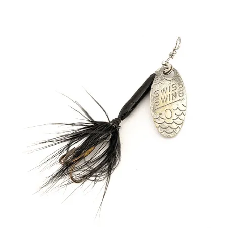 Frankrijk is de oorsprong van deze 1,6g (1/16oz) spinner, die een klassieke Europese benadering van ultra-light kunstaasontwerp vertegenwoordigt. Met een lengte van 4,5cm (1 3/4") valt de Swiss Swing 0 (productcode 12621) van Renosky Lures op door zijn gestanste zilveren blad met een gedetailleerd schubbenpatroon op het onderste gedeelte. De zwarte body is gecombineerd met een dreg die is voorzien van zwarte veren, wat zorgt voor een contrastrijk zilver/zwart profiel. In 5/5 conditie zijn de metalen oppervlakken glanzend en de bevedering blijft vol en stevig. Het blad is duidelijk gemarkeerd met de modelnaam en maat, en is aan het draadframe bevestigd met een traditionele beugel.