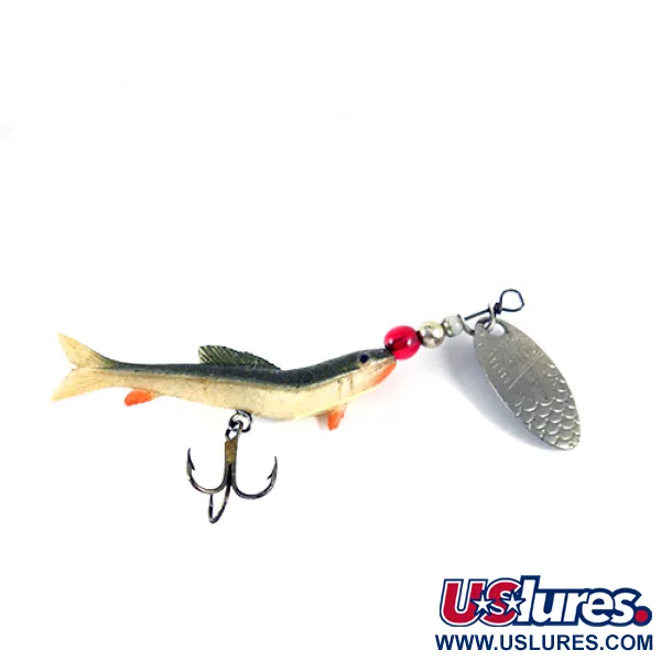 Een gestanst nikkelen blad met het opschrift 'SWISS SWING 1' vormt de voorzijde van dit kunstaas van Renosky Lures, geregistreerd onder code 1545. Met een gewicht van 3/32oz (2,5g) combineert dit aasje een traditionele inline spinner-opzet met een gedetailleerde softbait body in de vorm van een minnow met een totale lengte van 2 1/4" (6cm). De kleur Nickel zorgt voor een natuurlijke imitatie van een prooivis, met een donkere rug en een lichte buik. Een reeks kralen — één felrode en twee metalen — scheidt de clevis van het blad van het visvormige lichaam. Voor de visserij met licht materiaal is een enkele dreg direct onder de buik gemonteerd. Dit exemplaar is in 5/5 conditie, met een zeer schone afwerking van zowel het metaal als de soepele textuur van de body.