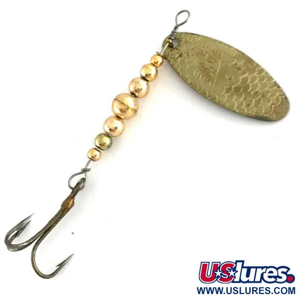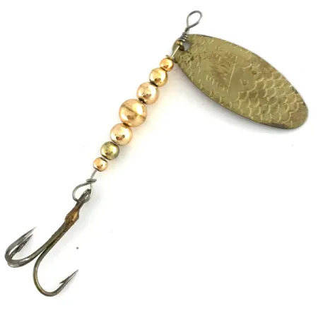 Zes gegradueerde messing kralen vormen de kern van deze 2,6g (3/32oz) Renosky Lures inline spinner. Deze 6 cm (2 1/4") lange spinner, bekend als de Swiss Swing en geïdentificeerd door code 8455, is afkomstig uit Frankrijk en weerspiegelt de traditie van het land in het vervaardigen van precisie-hengelsportmateriaal. Het messing blad is gestanst met een fijne schubbenstructuur, wat een duidelijk visueel contrast vormt met de gepolijste kralen. Een stevige metalen as verbindt het bovenste oog met een bronzen dreg aan de staart. Elk onderdeel, van de verzwaarde kralen tot het gestructureerde blad, behoudt zijn messing afwerking. Dit exemplaar verkeert in 5/5 conditie, ziet er opmerkelijk goed bewaard uit en behoudt zijn originele metaalglans op alle oppervlakken.