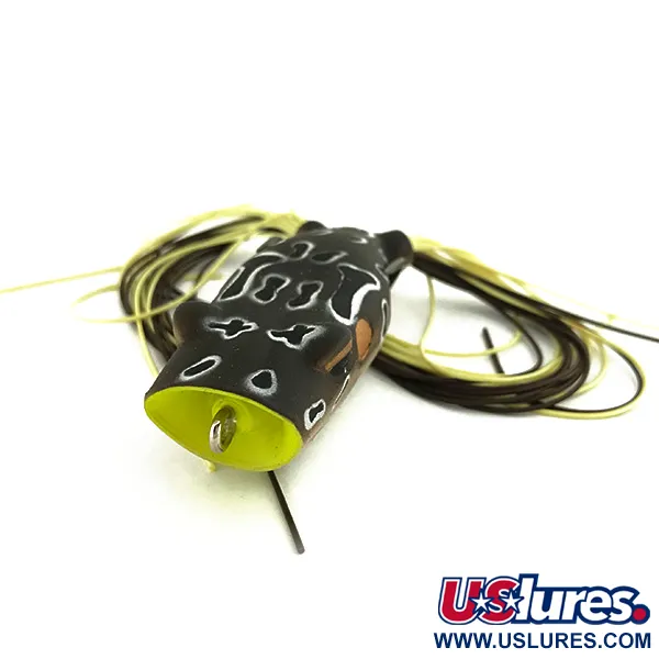 Versierd met een contrastrijk zwart-bruin gevlekt patroon, is dit oppervlaktekunstaas een klassiek voorbeeld van Amerikaans vakmanschap. Met een gewicht van 1/2 oz (14 g) beschikt de Terminator Popping Frog (productcode 6865) over een diepe, holle chartreuse-gele voorkant, speciaal ontworpen voor 'popping'-technieken in dichte begroeiing. De constructie bevat een wierloos haaksysteem dat vlak tegen het zachte materiaal aanligt, waardoor hij door leliebladen en dichte vegetatie kan navigeren waar traditioneel kunstaas zou vastlopen. Lange, slepende rubberen slierten in geel en zwart steken aan de achterkant uit om de beweging van kikkerpoten na te bootsen. Dit kunstaas verkeert in 5/5 conditie, met schone oppervlakken en heldere kleuren op het lichaam en de skirts. Gefabriceerd in de VS, heeft het merk Terminator zijn reputatie opgebouwd door zich te concentreren op duurzame soft-body ontwerpen die bestand zijn tegen herhaalde aanbeten van agressieve baarzen. Een stevig, zilverkleurig oog zit centraal in de bek voor directe bevestiging aan zware gevlochten lijnen.
