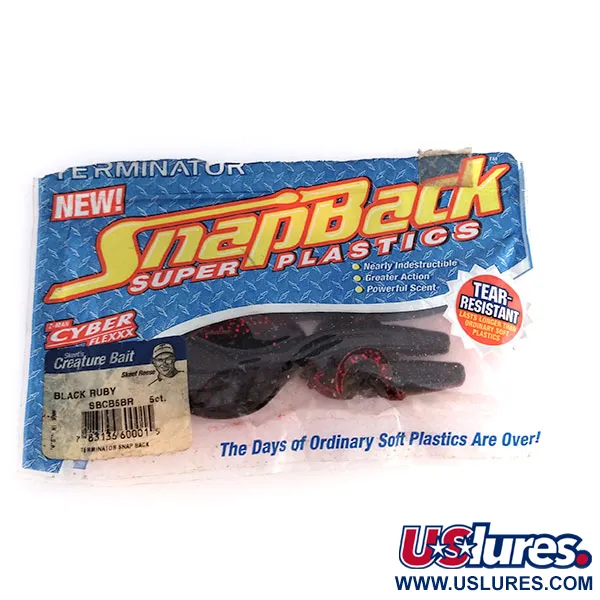 Deze softbaits van 4" (10 cm), afkomstig uit de oorspronkelijke Amerikaanse productiefaciliteiten, vertegenwoordigen een gedenkwaardig tijdperk in de Amerikaanse jiggeschiedenis. De diepe Black Ruby-afwerking op de Terminator Snapback Creature heeft een donkere, ondoorzichtige basis die rijkelijk is voorzien van rode glitters die het licht vangen via de doorschijnende aanhangsels. Geïdentificeerd door productcode 9826, bevat dit pakket drie exemplaren in ongebruikte staat, met behoud van hun originele elasticiteit en fabriekstextuur. Het ontwerp bevat een zwaar geribbelde body, gevolgd door twee sets krulstaarten en een gespleten staarteinde, een configuratie die typisch is voor op waterverplaatsing gerichte creature baits. Hoewel Terminator algemeen bekend staat om zijn wire baits, zijn deze siliconen producten speciaal gemaakt voor gespecialiseerde jigging-technieken waarbij duurzaamheid een primaire vereiste was. Elk item in de set is fabrieksnieuw, met een score van 6 voor conservering.