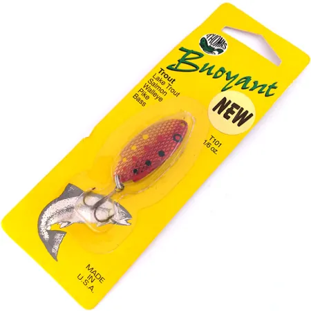 Deze metalen Thomas Buoyant lepel van 3/16 oz (5g) heeft een Red Trout-afwerking met een getextureerd schubbenpatroon over een koperkleurige basis, geaccentueerd door duidelijke rode, zwarte en gele markeringen. Dit in de VS gemaakte kunstaas van 1 1/2" (4 cm) heeft productcode 10194 en is een schoolvoorbeeld van het Thomas Buoyant-ontwerp. De unieke, asymmetrische lichaamsvorm is specifiek ontworpen voor werpen en trollen waarbij een duidelijke zijwaartse actie vereist is. Dit exemplaar is ongebruikt en zit in de originele gele blisterverpakking met een conditiescore van 6. De verpakking vermeldt de effectiviteit voor verschillende vissoorten, waaronder snoekbaars, snoek en baars, hoewel het een legendarische keuze blijft voor forelvissers. De montage bestaat uit een enkele splitring en een scherpe dreg, die beide de schone afwerking vertonen die verwacht mag worden van een goed bewaard gebleven vintage item.