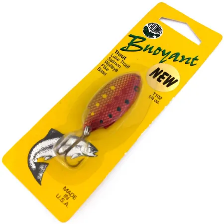 Een levendig goud en rood schubbenpatroon kenmerkt de body van deze lepel, geaccentueerd door duidelijke gele en zwarte stippen op het gebogen oppervlak. Met een lengte van 1 3/4" (4,5 cm) en een gewicht van 1/4 oz (7 g), is deze Thomas Buoyant ongebruikt gebleven in de originele gele kartonnen verpakking, voorzien van productcode T102GR (ook bekend als 10250). Geproduceerd door Thomas Spinning Lures, Inc. in Hawley, PA, beschikt deze Amerikaanse klassieker over een robuuste dreg en een constructie van gestanst metaal, geschikt voor werpen of trollen. De voorzijde van de kaart vermeldt diverse doelsoorten, waaronder forel, zalm en snoekbaars, terwijl een gouden 'NEW' sticker de vintage staat benadrukt. Op de achterzijde beschrijven de instructies riviervistechnieken, zoals het laten 'wapperen' van het kunstaas nabij de bodem om de juiste diepte te bereiken voor diverse roofvissen. Dit exemplaar behoudt zijn originele afwerking en hardware aangezien het nooit is ingezet.