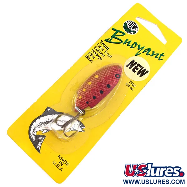 Verguld messing vormt de basis voor de gedetailleerde Red Trout afwerking op deze lepel van 7 g (1/4 oz). Ongebruikt in de originele gele blisterverpakking, toont dit exemplaar de traditionele Amerikaanse productiestandaarden van Thomas Spinning Lures, Inc. gevestigd in Hawley, PA. Het patroon bestaat uit een dieprode schubbenstructuur met zwarte en gele stippen, bedoeld om het uiterlijk van een kleine forel na te bootsen. Gelabeld onder productcode 10282, verwijst de verpakking ook naar artikelnummer T102GR, wat staat voor het goud-rode kleurenschema. Een glanzend zilveren dreg is via een splitring verbonden met de staart, nog in de staat waarin hij de fabriek verliet. Sportvissers gebruiken Thomas Buoyant kunstaas al decennia lang bij het vissen op soorten zoals zalm, snoekbaars en snoek in diverse rivier- en merenomgevingen. Gedetailleerde instructies op de achterkant van de kaart adviseren om iets stroomopwaarts of direct dwars op de stroming te werpen om de diepte tijdens het binnendraaien te beheersen.