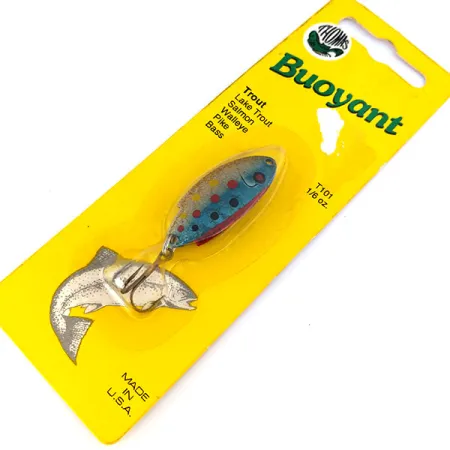 Met een Blue Trout afwerking en opvallende rode en blauwe stippen is deze lepel van 5 g (3/16 oz) een klassiek stukje Amerikaanse hengelsportgeschiedenis. De lepel is 4 cm (1 1/2") lang en heeft een unieke, visachtige vorm met een kenmerkende buiging om het licht te vangen. Dit specifieke exemplaar heeft productcode 10661 en is ongebruikt, bewaard in de originele gele blisterverpakking. Thomas Spinning Lures patenteerde dit ontwerp voor het eerst in 1946. De populariteit onder forel- en zalmvissers is te danken aan de afwerking van juwelierskwaliteit. De achterkant van de verpakking benadrukt de effectiviteit voor soorten zoals snoekbaars en snoek bij een matig langzame inhaalsnelheid. De in de VS gemaakte lepel is uitgerust met een stevige dreg. Een fabriekssticker op de achterzijde identificeert de variant als item T101B-BB, wat het zilver-blauwe kleurenpalet bevestigt.