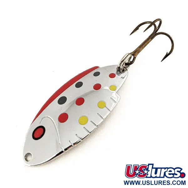 De vernikkeling dient als basis voor een klassiek patroon van rode, zwarte en gele stippen op de voorzijde van deze 4 cm (1 1/2") lepel. Met een gewicht van 5 g (3/16 oz) heeft deze Thomas Buoyant (productcode 11248) de traditionele lepelvorm die de Amerikaanse forelvisserij al generaties lang definieert. De achterkant toont duidelijk de naam van de fabrikant en de 'BUOYANT'-stempel, diep in het metaal geslagen. Een opvallend rood accent volgt de buitenste curve, terwijl de voorkant is gedetailleerd met een gestileerd oog. De dreg en het bevestigingsmateriaal zijn nog steeds glanzend en scherp, wat de 5/5 conditie weerspiegelt. Dit in de USA gemaakte exemplaar behoudt zijn hoogglans over het hele lichaam, waarbij de lak strak en levendig is gebleven.
