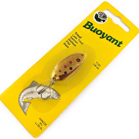 Afgewerkt in een kenmerkend Copper Trout patroon met zwarte en rode stippen over een goudkleurige basis, deze vintage Thomas Buoyant lepel zit nog in de originele vintage verpakking. Geproduceerd in Hawley, Pennsylvania, is deze 4 cm (1 1/2") lepel een klassiek stuk Amerikaanse hengelsportgeschiedenis van Thomas Spinning Lures, Inc. Het gewicht van 4,7 g (1/6 oz) maakt het een veelzijdige keuze voor het vissen op forel, zalm en zelfs snoekbaars in verschillende wateromstandigheden. Dit specifieke exemplaar heeft productcode T101B-G en een conditiescore van 6, wat betekent dat het volledig ongebruikt is en nog nooit het water heeft gezien. De hardware bevat een hoogwaardige dreg bevestigd via een stevige splitring, standaard voor deze in Hawley gemaakte lepels. Op de achterkant van de gele kaart suggereren gedetailleerde instructies dat het kunstaas effectief is bij het werpen dwars op de stroming in rivieren of bij het binnenvissen op verschillende dieptes in meren. Het "MADE IN U.S.A." stempel in de linkerbenedenhoek van de verpakking getuigt van de langdurige productietraditie van het merk.