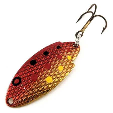 Gehamerde texturen op de 'Rainbow Hammered Red' afwerking zorgen voor een multidimensionale schittering die de Thomas Buoyant-serie al decennia lang kenmerkt. Met een lengte van 38 mm (1 1/2") is de kenmerkende gebochelde vorm van deze in de VS gemaakte lepel een onmisbaar item voor forel- en zalmvissers. Op de gepolijste goudkleurige achterkant staat het merkteken "THOMAS 1/6 oz BUOYANT", hoewel dit specifieke exemplaar in de catalogus staat als 5,3 g (3/16 oz) onder productcode 11696. De bovenkant heeft een rijk rood verloop dat overgaat in goud, versierd met een reeks zwarte, rode en gele stippen. Het materiaal is in uitstekende staat, voorzien van een sterke dreg die is bevestigd via een stevige splitring. In een conditie van 5/5 behoudt het kunstaas zijn originele glans en scherpe details.