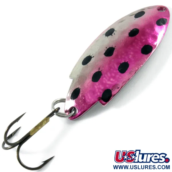De vernikkelde afwerking vormt een contrastrijke achtergrond voor het levendige roze forelpatroon en de opvallende zwarte stippen. Met een gewicht van 7 g (1/4 oz) is deze 4,5 cm (1 3/4") Thomas Buoyant, productcode 4514, een typisch Amerikaanse lepel. Op de holle achterzijde is de stempel "THOMAS 1/4 OZ T102 BUOYANT" scherp en perfect leesbaar tegen het gepolijste zilverkleurige metaal. Dit exemplaar verkeert in 5/5 conditie en vertoont geen sporen van gebruik of slijtage op het geverfde oppervlak. De hardware bestaat uit een robuuste splitring aan de achterzijde, waaraan een scherpe, bronzen dreg is bevestigd. Een subtiele gehamerde textuur is zichtbaar onder de roze afwerking aan de bolle zijde, wat visuele complexiteit toevoegt aan de op forel geïnspireerde esthetiek. Dit specifieke exemplaar behoudt zijn originele glans en diepe kleurverzadiging.