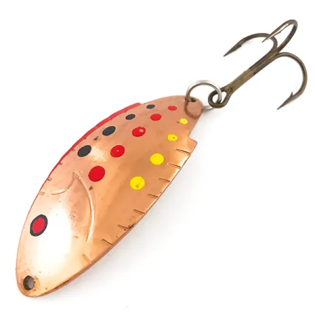 Duidelijk gestempeld op de achterzijde van het gebogen metalen lichaam, identificeren het 'THOMAS BUOYANT' merk en de 'PAT PEND' aanduiding deze 6 cm lepel als een hoofdbestanddeel van de Amerikaanse hengelsportgeschiedenis. De warme koperen basis is versierd met een reeks levendige rode, zwarte en gele stippen, een klassiek kleurenpatroon ontworpen voor hoge zichtbaarheid in verschillende wateromstandigheden. Met een gewicht van 14 g wordt het dikke ontwerp van de lepel gecombineerd met kenmerkende inkepingen langs één rand die het silhouet van een rugvin nabootsen. Het beslag bestaat uit een stevige splitring en een gebronsde dreg, die er beide structureel gezond uitzien. Beoordeeld met een conditie van 5/5, ziet de voorkant van het kunstaas er prachtig uit met strak lakwerk, terwijl de achterkant enkele lichte oppervlaktesporen en kleine ouderdomsvlekken vertoont die getuigen van de vintage status. Dit in de VS gemaakte exemplaar toont de duurzame productienormen die typisch zijn voor het merk Thomas.