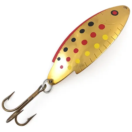 Gestanst met de modelnaam "T105" en "THOMAS BUOYANT" aan de concave zijde, vertegenwoordigt deze lepel een klassiek stukje Amerikaanse hengelsportgeschiedenis uit de VS. De Golden Trout-afwerking is bijzonder opvallend, met een gepolijste gouden basis versierd met rijen rode, zwarte en gele stippen die de levendige flank van een forel nabootsen. Met een lengte van 8,5 cm (3 1/4") en een gewicht van 21 g (3/4 oz), heeft dit kunstaas, geïdentificeerd door productcode 4931, een aanzienlijk profiel voor zijn formaat. De messing body is voorzien van karakteristieke geëtste kieuw- en vinlijnen langs de achterrand, wat textuur toevoegt aan de schittering. Een stevige dreg is bevestigd met een strakke splitring, wat de duurzame hardware weerspiegelt die van Thomas wordt verwacht. Wat betreft de conditie scoort dit exemplaar een 5/5, met een spiegelende afwerking en scherpe laklaag. Hoewel de achterkant van het aas gestanst is met 5/8 oz, maakt het gemeten gewicht van 21 g (3/4 oz) het een veelzijdig hulpmiddel voor zowel verre worpen als trollen.
