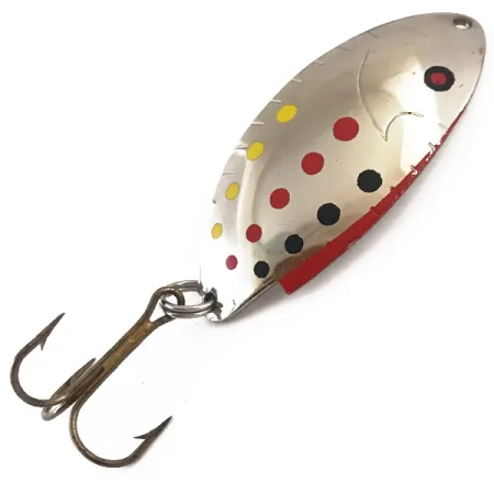 Duidelijk gestanst in het gepolijste nikkeloppervlak van de achterkant, bevestigt het merk 'THOMAS BUOYANT 1/2 OZ USA' de herkomst van deze klassieke Amerikaanse lepel. Met een lengte van 2 1/4" (6 cm) en een gewicht van 1/2 oz (14 g), heeft dit exemplaar een kenmerkend druppelprofiel met een reliëf vinnendetail dat kenmerkend is voor het merk Thomas. De afwerking is een glanzende nikkelcoating geaccentueerd door een traditioneel patroon van rode, gele en zwarte stippen op de bolle zijde, samen met een opvallende rode laklaag langs één rand. Dit specifieke kunstaas, geïdentificeerd door productcode 4959, behoudt zijn originele glans en heeft een conditiescore van 5/5. De hardware bestaat uit een stevige, gebronste dreg bevestigd via een robuuste splitring, geschikt voor werpen of trollen op soorten zoals forel en zalm. Een klein lijnoog is strak geponst bij de taps toelopende kop, wat zorgt voor een veilige verbinding met de onderlijn.