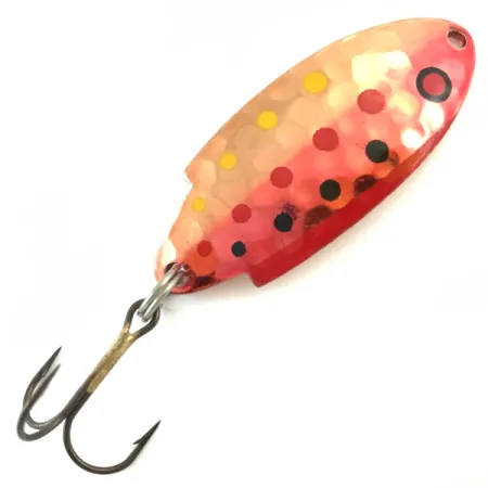 Een getextureerd honingraatpatroon siert de voorzijde van deze 1/4 oz (7g) lepel, wat zorgt voor een veelzijdig oppervlak voor de levendige 'Copper Trout' afwerking. Met een lengte van 4,5 cm (1 3/4") is de unieke lichaamsvorm van de lepel op de koperen achterzijde gestempeld met de aanduiding 'THOMAS T102 BUOYANT 1/4 OZ'. Het kleurenpalet is bijzonder opvallend: een dieprode staart loopt over in een lichter roze en goudkleurig middengedeelte, geaccentueerd door een reeks gele, rode en zwarte stippen. Verzamelaars zullen dit herkennen als productcode 5174, een klassiek Amerikaans ontwerp uit de VS dat al decennia lang een vaste waarde is voor forel- en baarsvissers. Het beslag is in uitstekende staat, voorzien van een stevige dreg die via een splitring aan de basis is bevestigd. Gezien de 5/5 conditie blijft de afwerking glanzend en zijn de markeringen scherp en leesbaar. Het taps toelopende profiel maakt hem zeer geschikt voor zowel werpen in stromend water als licht trollen. Er is een enkel oogje voor de lijn in de kop van de lepel geponst.