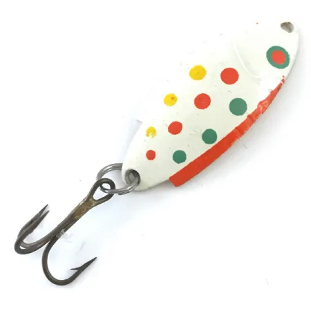 Witte verf dient als basis voor het White Trout kleurenschema, dat wordt geaccentueerd door rode, groene en gele stippen op de 4 cm lange body. De achterkant van deze in de USA gemaakte lepel heeft een heldergele afwerking waarin de merknaam Thomas en de modelnaam Buoyant duidelijk in het metaal zijn gestanst. Met een gewicht van 5 g is het kunstaas voorzien van een opvallende oranjerode streep langs de onderste ronding voor extra visueel contrast. Zowel de geverfde oppervlakken als het beslag zijn uitzonderlijk goed bewaard gebleven, wat resulteert in een conditiescore van 5/5. Gecatalogiseerd onder productcode 5358, is dit exemplaar uitgerust met zijn originele donker afgewerkte dreg en een stevige metalen splitring.
