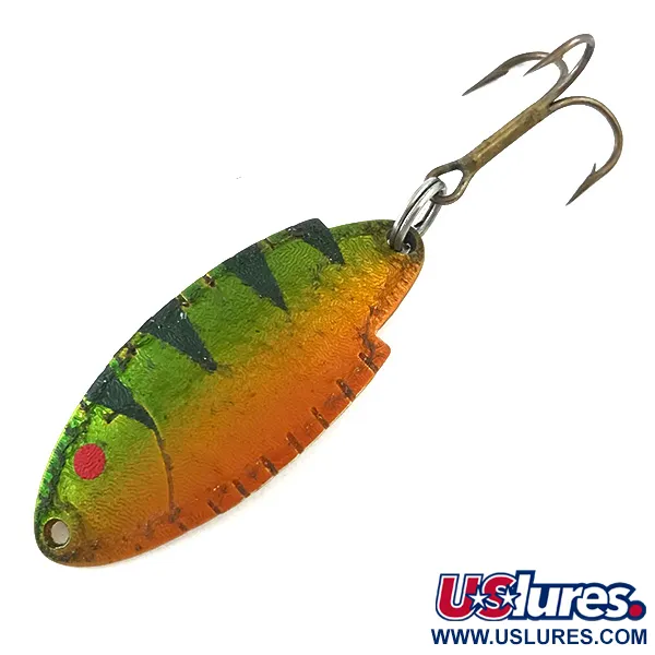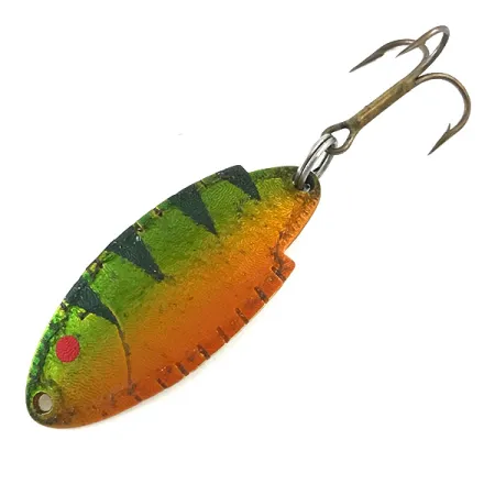 Met een gewicht van 5g (3/16oz) heeft dit exemplaar de klassieke lepelvorm die Thomas kunstaas al decennia lang een vaste waarde maakt bij het vissen op forel. De levendige Fire Tiger-kleur is aangebracht op een gestructureerd oppervlak aan de voorzijde, overgaand van groen naar oranje met krachtige verticale strepen en één rood oog. De achterzijde is afgewerkt in gepolijst goud, duidelijk gestempeld met de merknaam Thomas, de modelnaam Buoyant en de aanduiding T101. Met een lengte van 4cm (1 1/2") komt het profiel precies overeen met een kleine aasvis, waardoor het een veelzijdige keuze is voor het werpen in beken of meren. Deze in de VS gemaakte lepel, geregistreerd onder productcode 5359, verkeert in 5/5 conditie, waarbij de haken en splitringen uitstekend onderhouden zijn. Het ontwerp maakt gebruik van een licht gewelfd lichaam, bedoeld voor het werpen en binnenvissen in diverse zoetwateromgevingen.