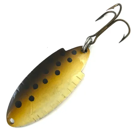 Het Golden Trout kleurpatroon, met een donkerbruin verloop langs de rug dat overgaat in een levendige geelgouden buik, kenmerkt de afwerking van dit exemplaar. Op de achterzijde is duidelijk het model T102 gestanst, wat het identificeert als een 7g (1/4oz) lepel van de Thomas Spinning Lure Company. Met een lengte van 4,5 cm (1 3/4") wordt het profiel van de lepel geaccentueerd door gekartelde inkepingen langs de onderrand en nauwkeurig geplaatste zwarte stippen. Een robuuste dreg met bronzen afwerking is bevestigd via een roestvrijstalen splitring, geschikt voor het werpen in beken of trollen in diepe meren. De staat van deze Amerikaanse klassieker is 5/5, met een schoon oppervlak en heldere belettering. De naam Buoyant en het gewicht zijn diep ingeslagen, wat getuigt van de productiestandaarden onder productcode 5391. Deze gewichtsklasse is favoriet bij vissers die op forel en baarsvissen vissen wanneer een kleiner profiel nodig is.