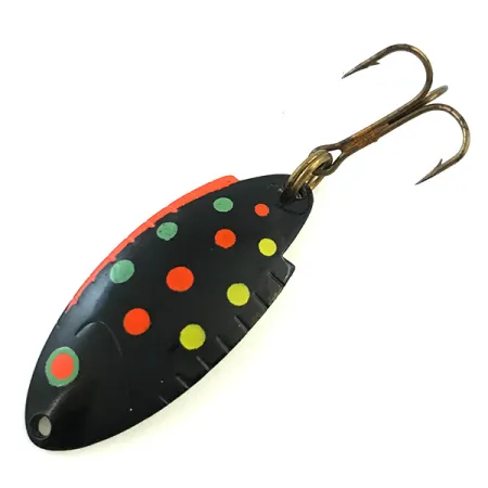 Deze lepel is opvallend beschilderd in het "Black Trout"-patroon, met duidelijke groene, oranje en gele stippen op een donkere basis. Met een lengte van 4 cm (1 1/2") en een gewicht van 5 g (3/16 oz) verkeert dit exemplaar, gecatalogiseerd onder productcode 5392, in uitstekende staat (5/5 conditie). De achterzijde is voorzien van een heldergele coating en duidelijk gestempeld met de aanduiding "THOMAS T-101 BUOYANT". De originele dreg met bronzen afwerking is stevig bevestigd aan de achterkant via een robuuste splitring. Dit klassieke ontwerp, geproduceerd in de VS, heeft de kenmerkende gekerfde randen voor een uniek profiel tijdens het werpen of trollen in zoet water. Een klein rond oogje is voorgeboord in de neus voor eenvoudige bevestiging van lijn of wartel.
