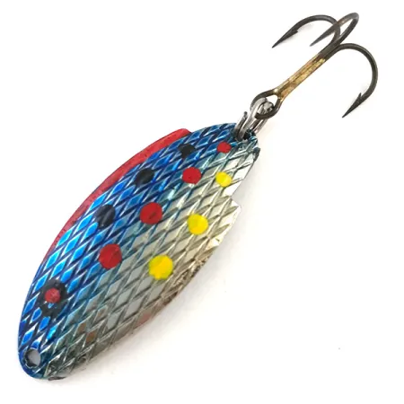 Deze in de VS gemaakte lepel is voorzien van een kenmerkende ruitvormige schubbenstructuur en is afgewerkt in een levendig Hammered Nickel / Blue Trout kleurenschema. Met een gewicht van 3/16oz (5g) en een lengte van 1 1/2" (4cm) toont het het klassieke vakmanschap dat typerend is voor het merk Thomas. De voorkant vertoont een opvallende overgang van blauw naar zilver, versierd met zwarte, rode en gele stippen, terwijl de achterkant diep is gestempeld met "THOMAS BUOYANT" en het specifieke gewicht. De hardware, inclusief de originele dreg en splitring, is uitzonderlijk schoon, wat bijdraagt aan een conditiescore van 5/5 voor dit exemplaar. Dit specifieke kunstaas is gecatalogiseerd onder productcode 5416.