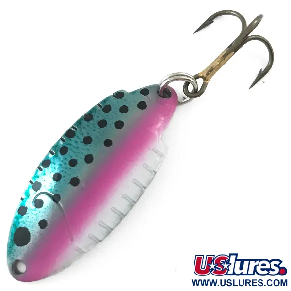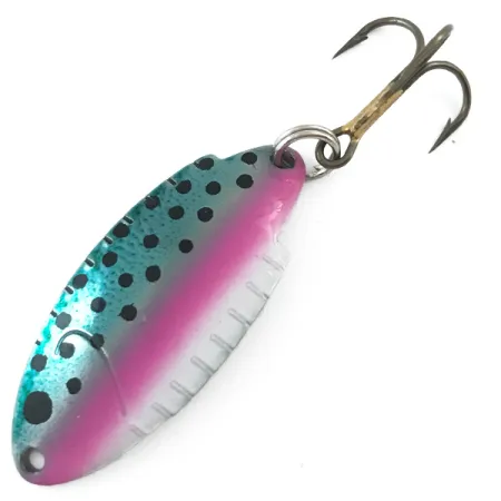 Op de gepolijste nikkelen achterzijde van deze 1 1/2" (4 cm) lepel is de gewichtsaanduiding van 3/16 oz (5 g) duidelijk gestempeld. Deze Thomas Buoyant, met productcode 5544, heeft een klassiek Forel / Nikkel kleurenschema, met een metallic groenblauwe bovenkant en een dieproze zijlijn geaccentueerd met duidelijke zwarte stippen. Het gestempelde metalen lichaam is voorzien van karakteristieke inkepingen langs de zijkant, een ontwerpelement dat onlosmakelijk verbonden is met de productiegeschiedenis van het merk in de VS. Een scherpe, bronzen dreg is bevestigd via een zilveren splitring aan de achterzijde. Gezien de conditiescore van 5/5 heeft het kunstaas een ongelooflijk goed bewaarde afwerking, waarbij de gestempelde tekst "THOMAS 3/16 OZ BUOYANT" scherp en leesbaar blijft tegen het reflecterende nikkeloppervlak.