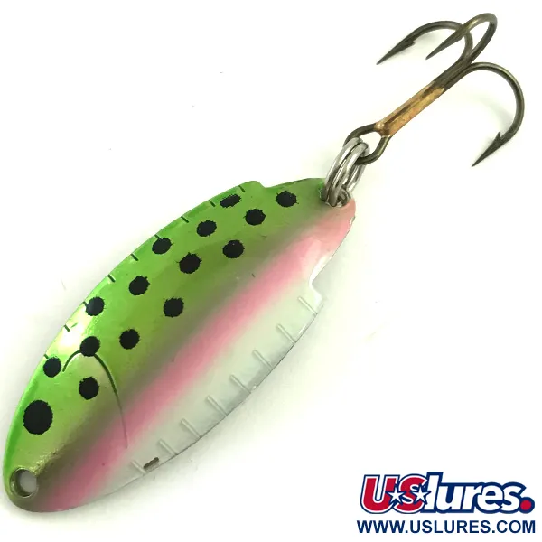 Met een gewicht van 3/16 oz (5 g) heeft deze in Amerika gemaakte lepel een klassieke Forel / Zilver afwerking die het uiterlijk van een kleine regenboogforel nabootst. Het lichaam van 1 1/2" (4 cm) is zorgvuldig gestempeld met de naam Thomas Buoyant en patentinformatie op de gepolijste zilveren onderkant. De bolle zijde is versierd met een levendige groene rug en duidelijke zwarte stippen, gescheiden door een zachte roze zijlijnstreep. Beoordeeld met een conditie van 5/5, blijft de verf strak en het metaal glanzend over het asymmetrische frame. Langs de rand zijn kenmerkende schubachtige kartels zichtbaar, een technisch detail dat is ontworpen om de lichtreflectie tijdens het werpen of trollen te vergroten. Het kunstaas is uitgerust met een robuuste splitring en een scherpe, bronzen dreg. Met productcode 5822 is dit exemplaar een goed bewaard gebleven voorbeeld van traditioneel vakmanschap uit de VS.