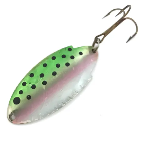 Handgeschilderde zwarte stippen op een limoengroene rug vallen direct op bij deze 1/2 oz (14 g) Thomas Buoyant lepel. Dit vintage kunstaas van 2 1/4" (6 cm), met productcode 6738, is voorzien van het iconische Rainbow Trout-patroon op een gepolijste nikkelbasis, compleet met een zachtroze zijlijn. De achterzijde van het metaal is diep gestempeld met 'THOMAS BUOYANT' en de modelcode T104, wat wijst op het specifieke ontwerp binnen de legendarische serie. Beoordeeld met een conditie van 5/5, is het exemplaar uitzonderlijk goed bewaard gebleven, waarbij het originele beslag en de dreg intact zijn gebleven. De unieke gebogen geometrie is een kenmerk van de benadering van het merk voor werpend en trollend vissen, ontworpen om een stabiel profiel in de waterkolom te behouden. De nikkelen afwerking zorgt voor een hoge zichtbaarheid, wat contrasteert met het gedetailleerde forelmotief voor gebruik in helder water.