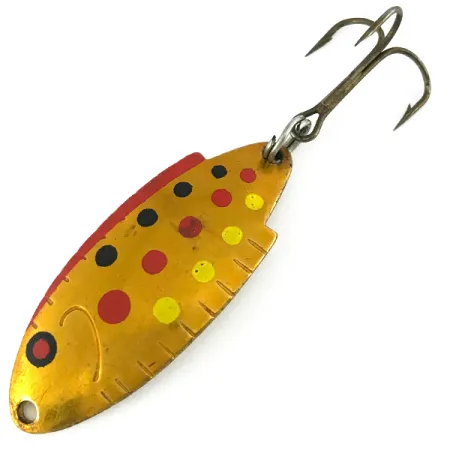 Goudkleurig messing vormt de basis van deze lepel van 7 g, voorzien van de kenmerkende ingekerfde staart die typerend is voor de klassieke ontwerpen van de Thomas Spinning Lure Company. De Golden Trout-afwerking op dit kunstaas van 4,5 cm is opmerkelijk strak, met levendige zwarte, rode en gele stippen geschilderd over het metallic gouden oppervlak om het uiterlijk van een beekforel na te bootsen. In de holle zijde is het model T102 duidelijk ingestempeld, wat duidt op de Amerikaanse oorsprong en de productienormen van de naam Thomas Buoyant. Met productcode 7195 verkeert dit exemplaar in 5/5 conditie, met behoud van de originele hoogglans und scherpe verfdefinitie, inclusief de subtiele reliëf-kieuwlijn bij het oog. Een stevige splitring verbindt de originele gebronsde dreg aan de achterzijde, wat zorgt voor hardware die nog even solide is als op de dag van productie.