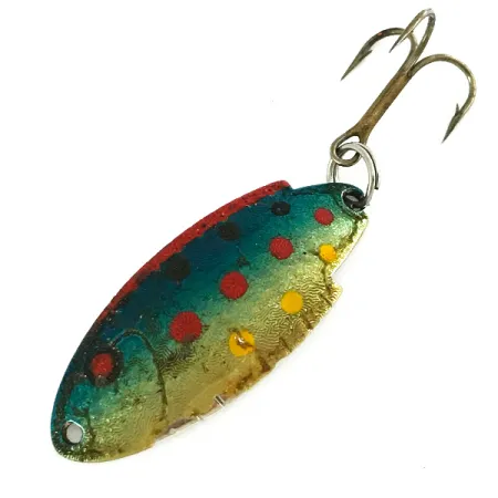 Op de gepolijste zilverkleurige achterzijde staan de woorden "THOMAS BUOYANT" duidelijk ingestanst, wat de erfenis van dit 4 cm (1 1/2") lange kunstaas identificeert. Dit specifieke exemplaar, gecatalogiseerd onder productcode 7226, is uitgevoerd in het Blue Trout-decor, een gedetailleerd patroon met een verloop van groenblauw naar goud, geaccentueerd door duidelijke rode en gele stippen. Met een gewicht van 5 g (3/16 oz) vertegenwoordigt deze lepel een klassieke Amerikaanse constructie. De hardware bestaat uit een bronskleurige dreg en een stevige metalen splitring. Met een conditiescore van 5/5 blijft de lak uitzonderlijk helder en zijn de ingestanste technische details op de metalen achterzijde perfect leesbaar. Een dunne rode verflijn loopt langs de bovenrand van de lepel en vormt een scherp contrast met de blauwe en groene tinten van de body.