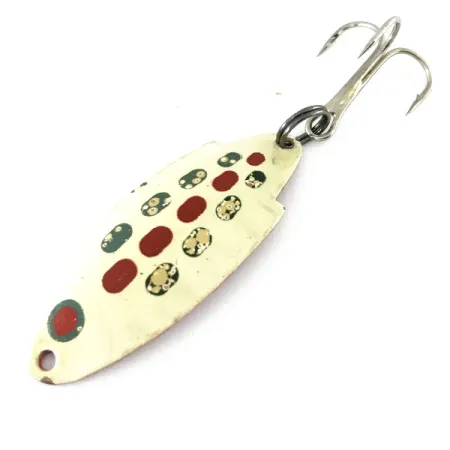 Met een lengte van 4,5 cm (1 3/4 inch) heeft het gestanste metalen lichaam van deze Thomas Buoyant lepel het klassieke 'gebochelde' profiel dat het al generaties lang tot een vast onderdeel in foreldozen maakt. De voorkant toont het Wit / Rood kleurenschema, dat verschijnt als een crème basis versierd met een reeks rode, donkergroene en goud-gemêleerde stippen. Wanneer de lepel wordt omgedraaid, komt een effen rode afwerking aan de achterzijde tevoorschijn, wat zorgt voor een hoog visueel contrast voor vissen die van onderen volgen. Gewaardeerd op 4/5, is de afwerking opmerkelijk schoon, met slechts de lichtste sporen van leeftijd. Met 7 g (1/4 oz) is hij ideaal gewogen voor precisieworpen in voedselstromen. Dit in de USA gemaakte exemplaar, gecatalogiseerd onder productcode 9509, is uitgerust met zijn originele dreg en splitring-hardware.
