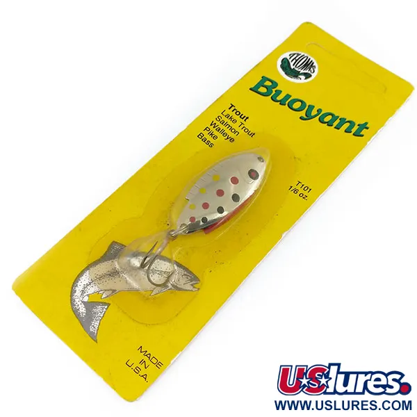 Een gepolijste nikkelen laag vormt de basis voor het kenmerkende patroon van rode en gele stippen op deze vintage Thomas Buoyant lepel. Dit exemplaar, herkenbaar aan productcode 9675, weegt 3/16 oz (5 g) en heeft een compacte lengte van 1 1/2" (4 cm). Het is ongebruikt gebleven in de originele gele kaartverpakking, waardoor de afwerking en het beslag in een 6/5 conditie behouden zijn. Geproduceerd in de VS, heeft het kunstaas een asymmetrische vorm die specifiek is ontworpen voor werpen of trollen in zoetwater op soorten zoals forel, zalm en baars. De verpakking benadrukt de geschiktheid voor glasoogbaars, snoek en meerforel, terwijl de achterkant van de lepel is uitgerust met een felrood lokplaatje dat aan de dreg is bevestigd. Deze klassieke kleurconfiguratie is ontworpen voor maximale zichtbaarheid onder verschillende wateromstandigheden en weerspiegelt de jarenlange productiestandaarden van het merk Thomas.