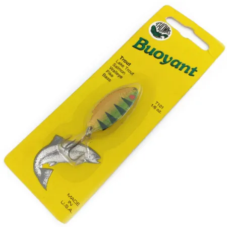 Met een gewicht van 3/16 oz (5 g) heeft deze lepel het klassieke Fire Tiger-patroon op een gestanste metalen body. Thomas Spinning Lures is al decennia een icoon van Amerikaanse makelij, wat blijkt uit de "Made in U.S.A."-markering op de felgele kaart. Het metalen blad van 1 1/2" (4 cm) is afgewerkt met een goudgele basis, voorzien van donkergroene verticale strepen en een rode stip om het profiel van een prooivis te imiteren. Dit specifieke exemplaar heeft productcode 9745 en zit nog in de originele winkelverpakking. Het kunstaas is ongebruikt, hoewel de vintage verpakking lichte opslagsporen en een oranje sticker van de winkelier op de achterkant vertoont. Ontworpen voor diverse vissoorten; de kaart vermeldt specifiek forel, zalm en snoekbaars als hoofddoelen voor dit kunstaas.