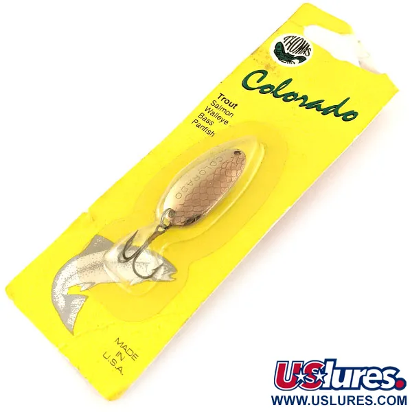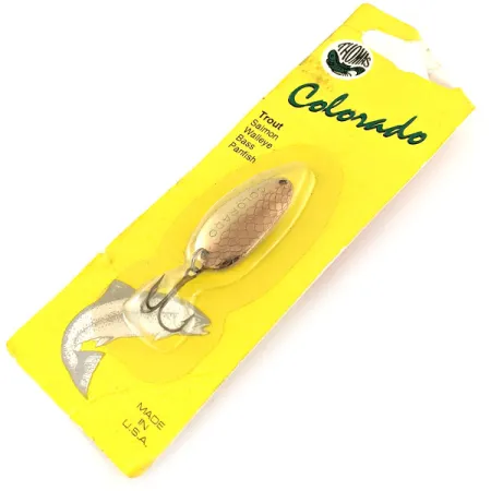 Goud- en nikkeltinten domineren de afwerking van deze 5g (3/16oz) lepel, voorzien van een duidelijk schubbenpatroon dat in het metalen oppervlak is gestanst. Met een lengte van 3,2cm (1 1/4") weerspiegelt dit Thomas Colorado model (Code: 11695) het functionele vakmanschap van Amerikaanse makelij. De voorzijde van de lepel is duidelijk gestempeld met de naam 'COLORADO', een ontwerp dat traditioneel wordt gebruikt voor werpen of trollen op forel, zalm en snoekbaars. Dit exemplaar is ongebruikt en bewaard gebleven in de originele gele blisterverpakking met het vintage Thomas-logo. De montage bestaat uit een stevige dreg bevestigd via een splitring, wat de strakke lijnen van de originele fabrieksassemblage toont. Een illustratie van een springende forel en de opdruk 'MADE IN U.S.A.' op het karton dragen bij aan het historische karakter van deze vondst uit het midden van de eeuw.
