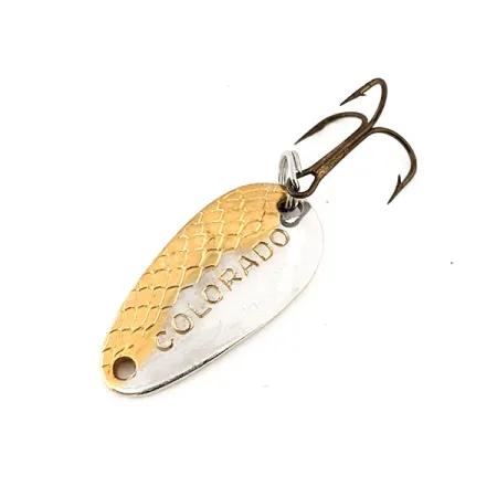 Gestempeld met een duidelijk schubpatroon over de gouden helft van zijn druppelvormige body, toont deze 2,3 cm lepel klassiek Amerikaans vakmanschap. De Thomas Colorado, vermeld onder productcode 12703, heeft een contrastrijke Nikkel / Goud afwerking die ontworpen is om licht vanuit meerdere hoeken te vangen. Hoewel het officiële gewicht 3 g is, zullen verzamelaars de 1/10 oz stempel op de achterkant van dit in de USA gemaakte exemplaar opmerken. Een splitring bevestigt een gebronsde dreg aan de staart, waardoor de originele setup voor licht werpend vissen behouden blijft. Deze specifieke lepel verkeert in 5/5 staat, met uitzonderlijk schone oppervlakken en scherpe "COLORADO" belettering op het vernikkelde gedeelte. Het Thomas Spinner Company logo is duidelijk zichtbaar op de achterkant, geplaatst tussen de gewichtsstempel en het bevestigingspunt van de haak.